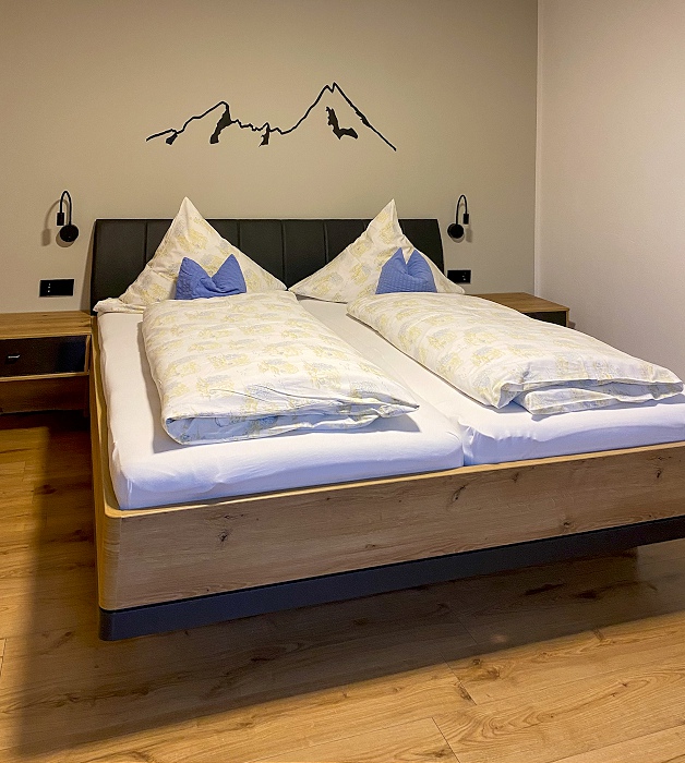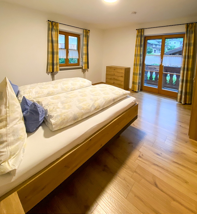 Die Zimmer haben Laminatböden in Holzoptik und sind im Landhausstil mit Fichtenholzmöbeln eingerichtet.