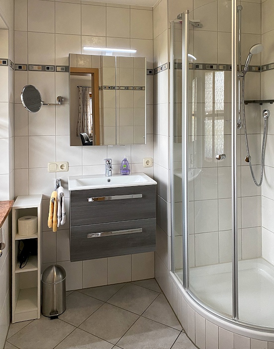 Die Ferienwohnung 2 hat eine Wohnfläche von ca. 43 qm, bietet Raum für 1-2 Personen und befindet sich im oberen Stock des Gästehauses.